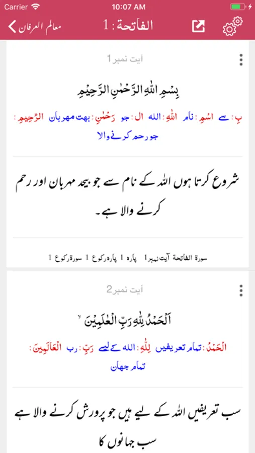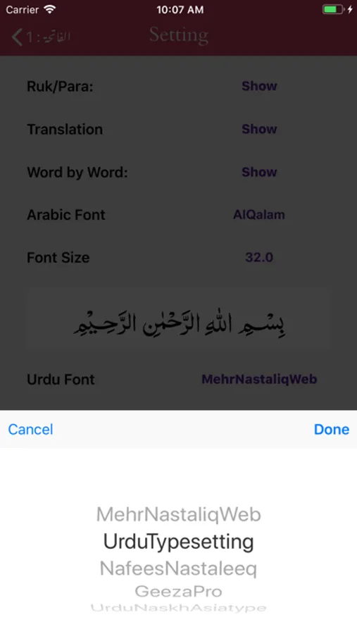 - Ability to show/hide Word by Word, Quran Translation (Tarjuma)