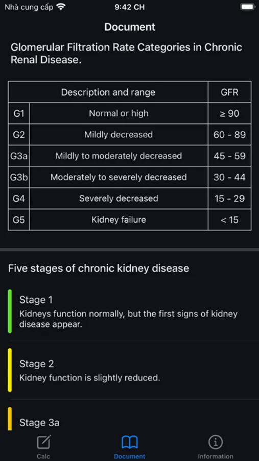 We also provide a table that compares GFR indicators with the stages of chronic kidney disease. If there are any additional or upgrade requests and other app to solve your problems, do not hesitate to contact us at email: phannhatd@gmail.com