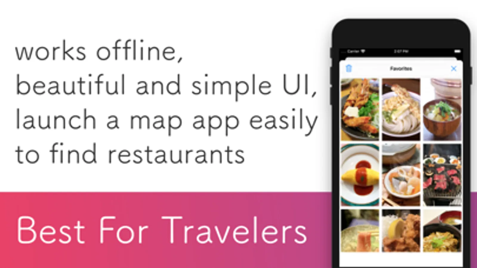 Once you find a meal you want to eat, you can launch a map app and search restaurants automatically just by pressing one button on this app. Internet is not required to see pictures.