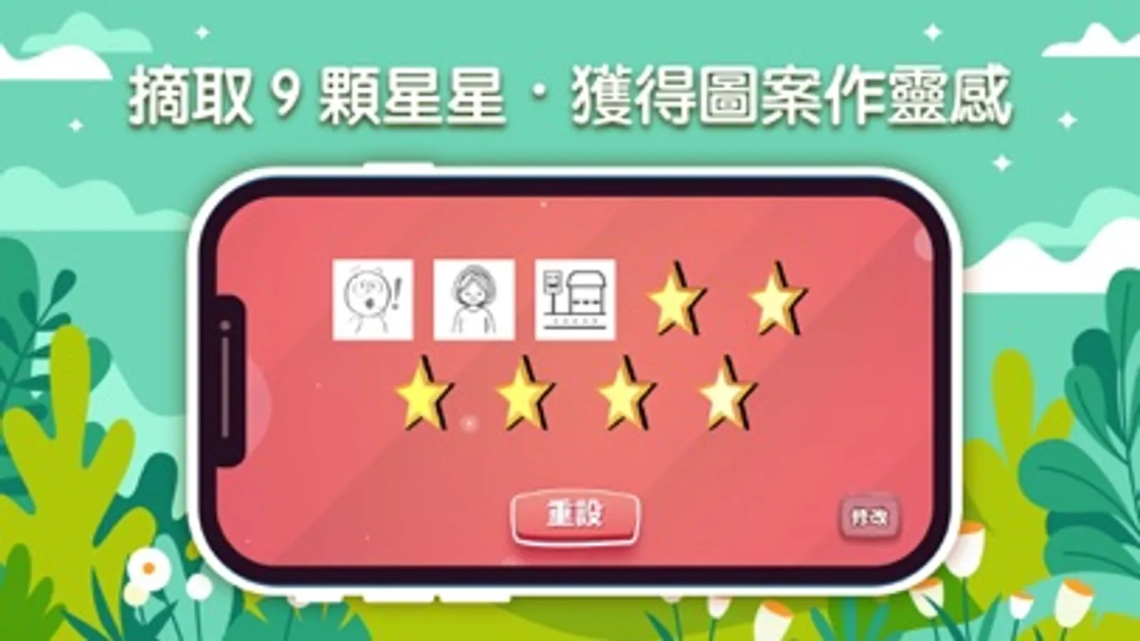 大家可以透過此應用程式,引導玩者說故事的遊戲。遊戲開始時,玩者需摘取9顆星,每顆星也代表不同圖案,隨意根據摘取的星之圖案,構思及說出一個可以連貫所有圖案的故事。 要挑戰難度,你可以邀請朋友一起參與,共同利用所有圖案去建構一個故事!