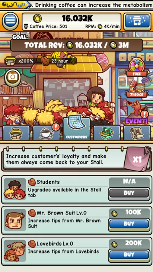 Note 1: Own Coffee Shop is an idle game. Some people also call it a clicker game. You just need to tap or click on your phone's screen to invite the customer. When you progress in the game, you can upgrade the items to make customer comes automatically even when you're idle or away, so you won't have to tap or click on the screen too often. (You can still tap or click on the screen to fasten your progress of course!)