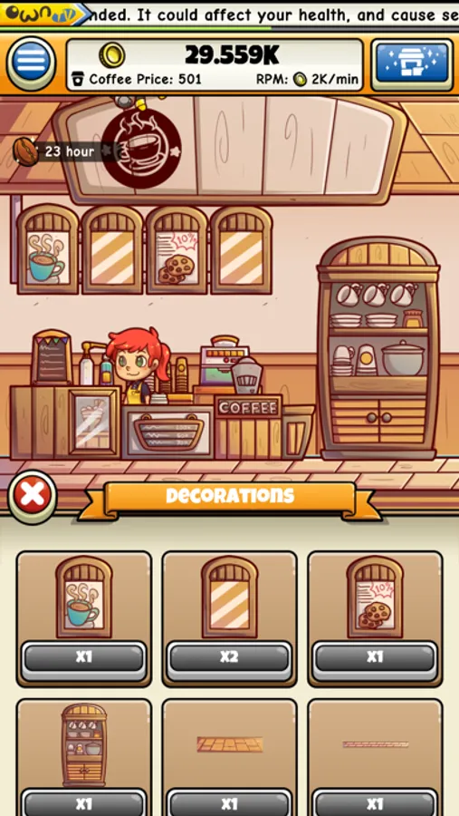 Note 2: Own Coffee Shop sometimes use "Idle Game" or "Clicker Game" at the end of the name. But we're still the same game, since both idle game and clicker game define the general gameplay of Own Coffee Shop. But don't worry, we can assure you that Own Coffee Shop is more than just a general idle or clicker game. Just give it a shot! XD