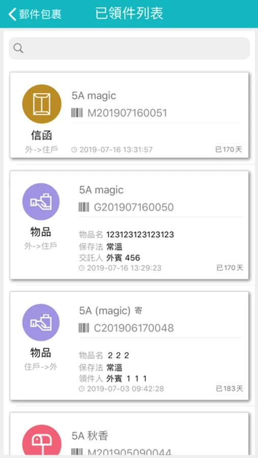 行政事務類:郵件包裹建檔、物品交託、現金交託、領件資訊、快速領件...等。