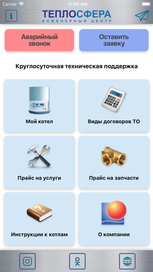 Мобильное приложение предназначено для информирования клиентов компании «Теплосфера» и оперативной связи клиентов с подразделением технической поддержки компании. Для информирования служит, организованный через мобильное приложение, доступ к страницам сайтов с технической информации о котлах в интернете. Если у пользователя на телефоне установлено подходящее приложение для просмотра файлов, то он может открыть файл с прайсом услуг и прайсом на запчасти в своём мобильном телефоне или скачать файл соответствующего прайса для того, чтобы потом посмотреть его на компьютере. Через мобильное приложение пользователи могут подать заявку на заключение договора по выбранному тарифу (раздел «Виды договоров ТО»). Для оперативной связи с технической поддержкой компании «Теплосфера» пользователь может сделать прямо из мобильного приложения аварийный звонок на бесплатный номер телефона 8 800 707-75-85 (кнопка «Аварийный звонок») или написать заявку на обслуживание (раздел «Оставить заявку»). Для отправки заявок из мобильного приложения не используется сервер (сайт). Отправка заявок осуществляется путем формирования сообщения для электронной почты и открытия приложения электронной почты, которое установлено на телефоне. Через раздел «О компании» пользователь может посмотреть презентацию с информацией о компании «Теплосфера». Для пользования мобильным приложением пользователю не нужно выполнять регистрацию и авторизацию. Авторизация пользователя не входит в функционал приложения. Мобильное приложение позволяет перейти на аккаунты в социальных сетях и на официальный web-сайт компании «Теплосфера».