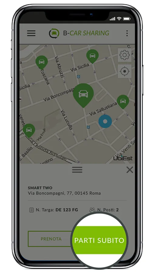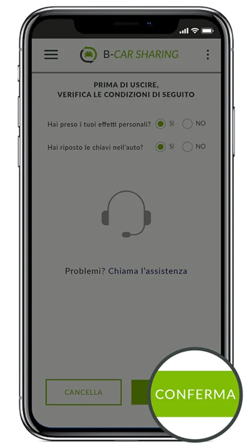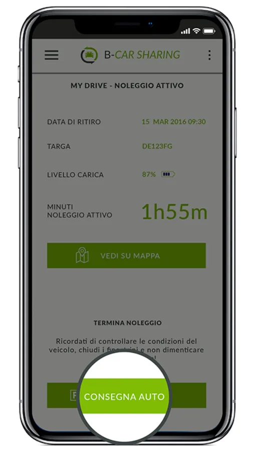 RESTITUZIONE. Al termine del noleggio, parcheggia l’auto nelle aree dedicate. Fai il check delle condizioni del veicolo con l’app, riponi le chiavi nel portaoggetti e scendi dall’auto. Blocca le portiere e concludi il noleggio sempre via app.