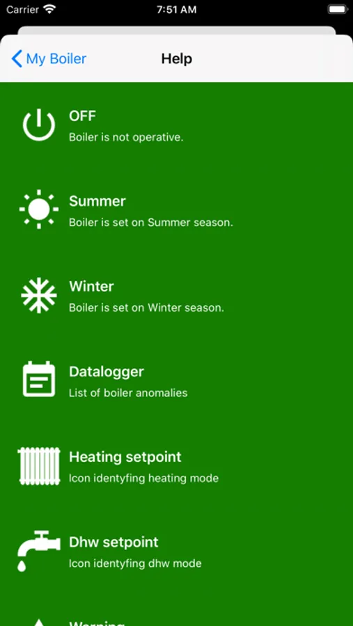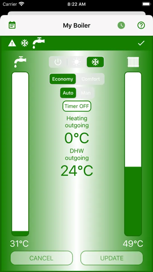 This app allows remote controlling of a boiler. It is possible displaying current device state: outgoing actual temperature, outgoing set points, operating mode, season and anomalies.