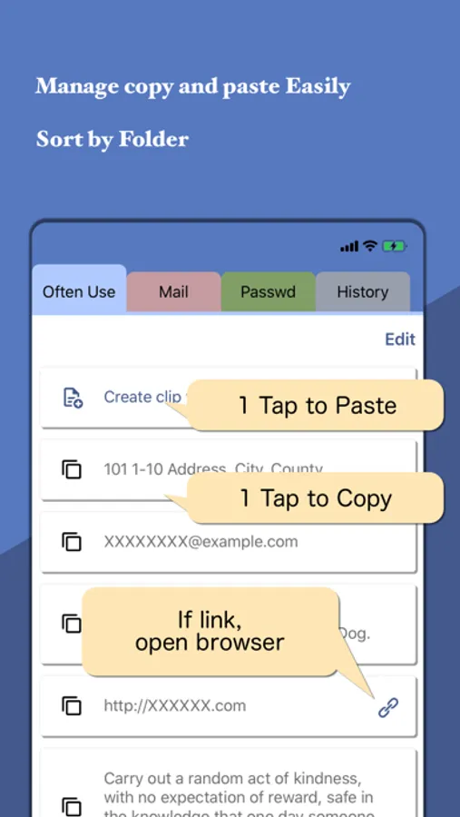 ・Keep and copy texts by only one tapping.