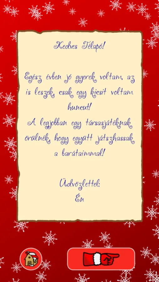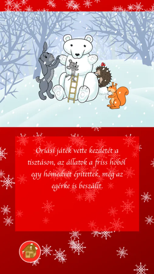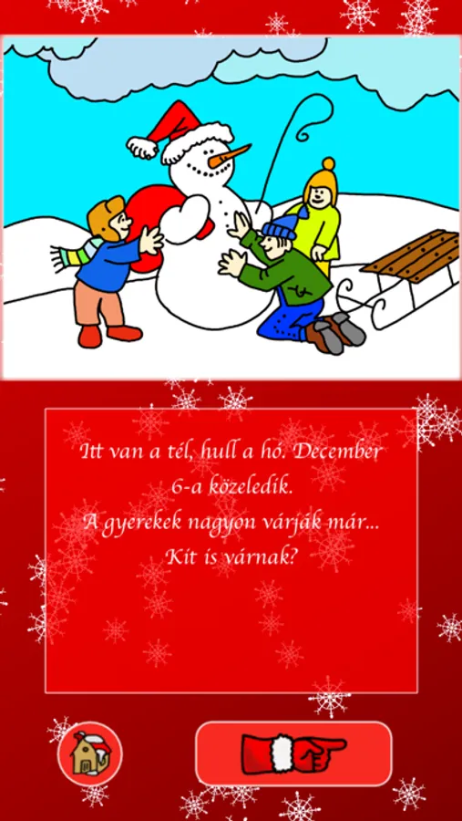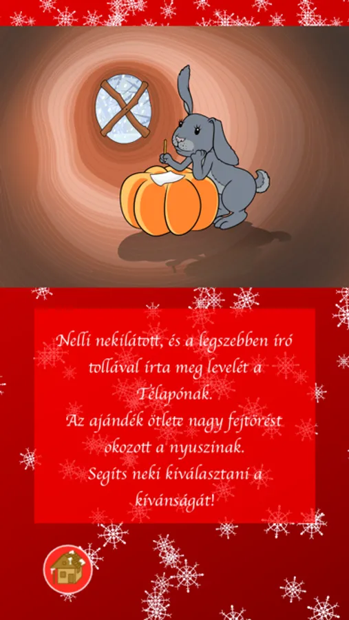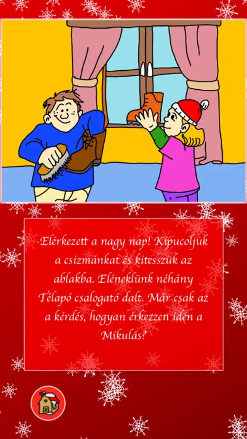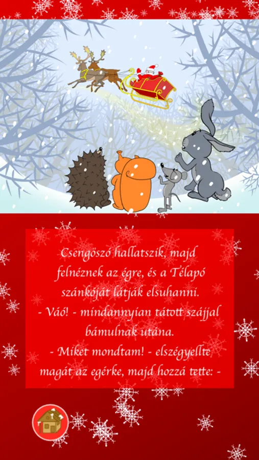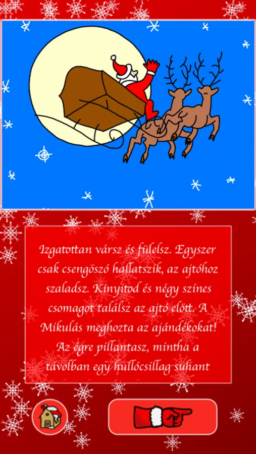 "Izgatottan vársz és fülelsz. Egyszer csak csengőszó hallatszik, az ajtóhoz szaladsz. Kinyitod és négy színes csomagot találsz az ajtó előtt. A Mikulás meghozta az ajándékokat! Az égre pillantasz, mintha a távolban egy hullócsillag suhant volna el... Lehet, hogy a Télapó szánkója?"