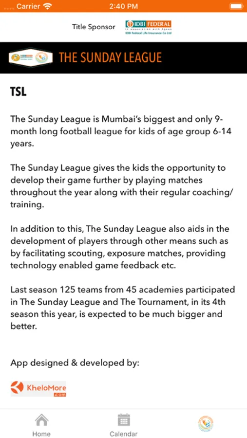 IDBI Federal - The Sunday League is the official app of The Sunday League tournament. Get instant access to all the tournament updates - fixtures, standing tables, results, news alerts, match analysis and much more. Watch all of our photos and videos exclusively on the app and stay updated with all the action from the pitch.