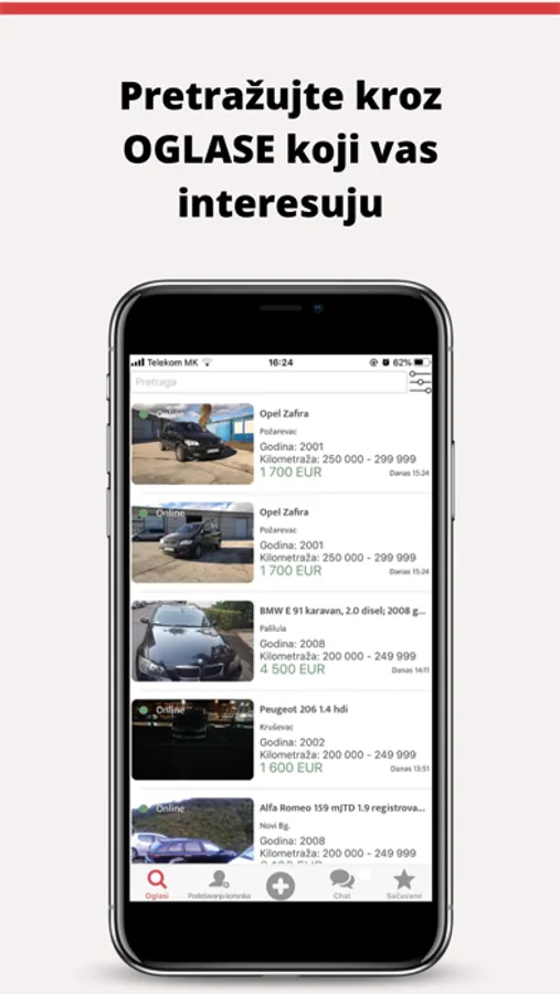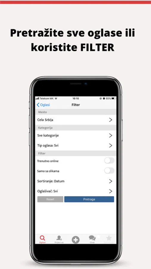 U svega nekoliko koraka možete pronaći sjajne ponude i komunicirati direktno sa prodavcem. Brzo i lako pronađite artikal koji vam je potreban, uz napredne opcije filtriranja kao što su: lokacijski filter, kategorija, tip oglasa i datum. Sačuvajte pretrage, ili omiljene oglase kako biste ih kasnije opet pregledali ili podelili sa prijateljem.