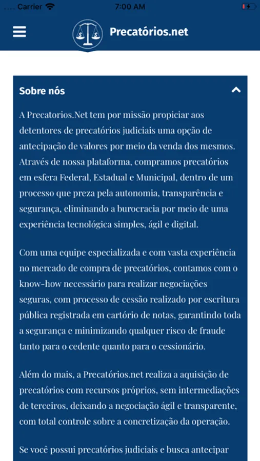 A Precatorios.Net tem por missão propiciar aos detentores de precatórios judiciais uma opção de antecipação de valores por meio da venda dos mesmos. Através de nossa plataforma, compramos precatórios em esfera Federal, Estadual e Municipal, dentro de um processo que preza pela autonomia, transparência e segurança, eliminando a burocracia por meio de uma experiência tecnológica simples, ágil e digital. Com uma equipe especializada e com vasta experiência no mercado de compra de precatórios, contamos com o know-how necessário para realizar negociações seguras, com processo de cessão realizado por escritura pública registrada em cartório de notas, garantindo toda a segurança e minimizando qualquer risco de fraude tanto para o cedente quanto para o cessionário. Cadastre-se em nossa plataforma e insira os dados solicitados. Entraremos em contato o mais breve possível.