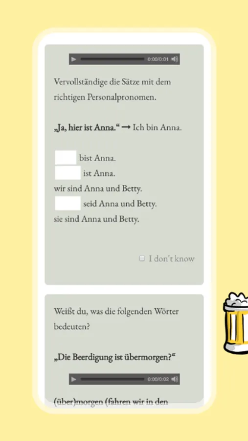 Wunderbla lessons take 10 minutes to complete: dialogues to listen to, questions to answer, 'mini-lessons', humor, varied accents, and a personalized revision program. Once you have sent your answers, you will receive a correction with your score for the day's lesson, personalized explanations, the German vocabulary that interests you, scripts for the audio files, etc.