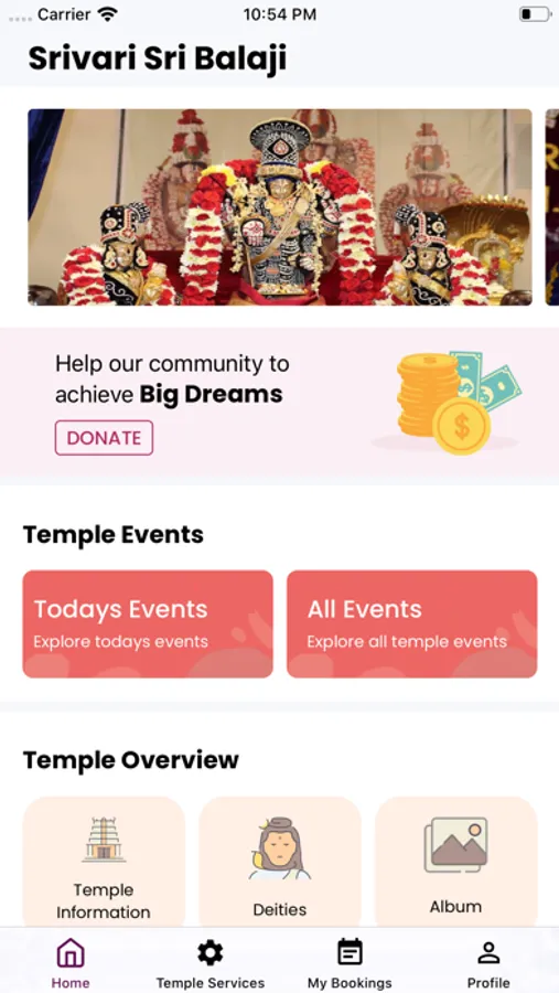 This the Devotees mobile app for Srivari temple consists of the following features - Temple Events, Notifications, Donations,Online Payment for Events,Family Registrations and temple media.