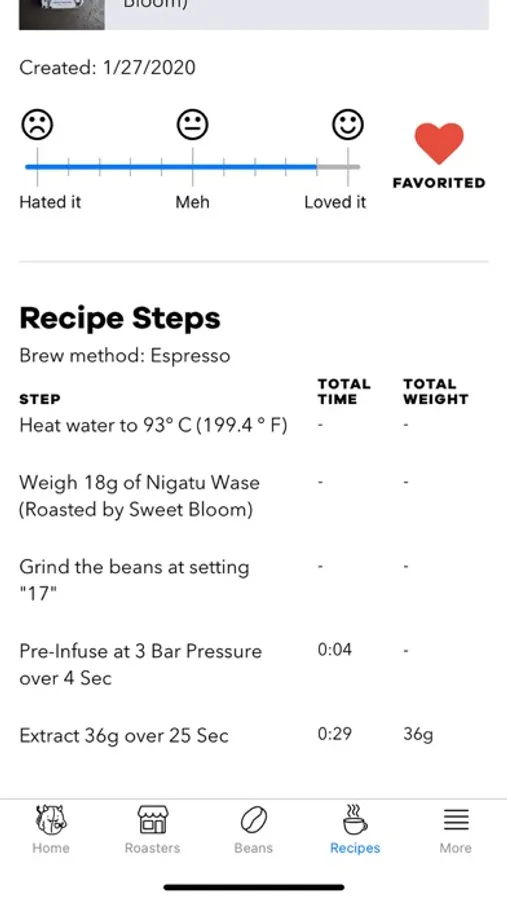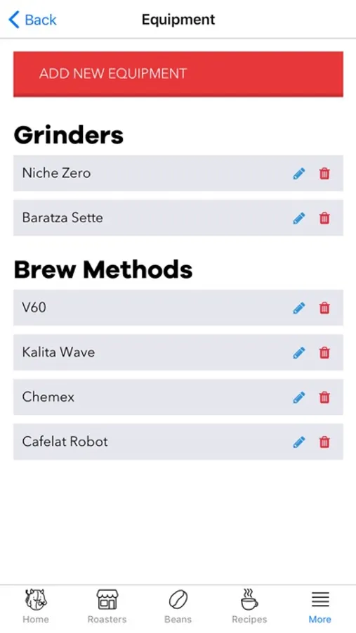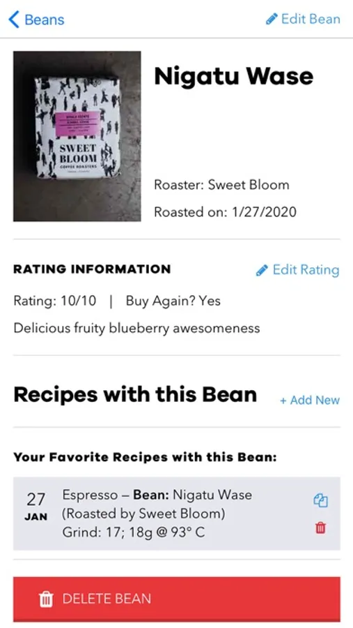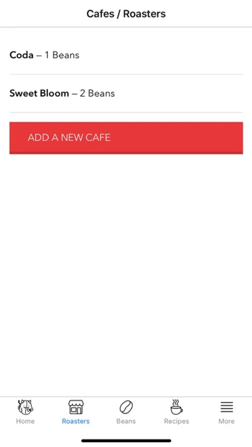 - Beans & Roasters -- Add your various beans and roasters to keep everything nice and organized, and see recipes for a specific bean.