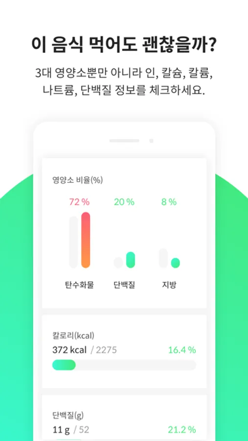 3대 영양소 비율, 칼로리, 칼륨, 인, 나트륨, 칼슘 등이 가이드라인에 적합한지 확인할 수 있어요.