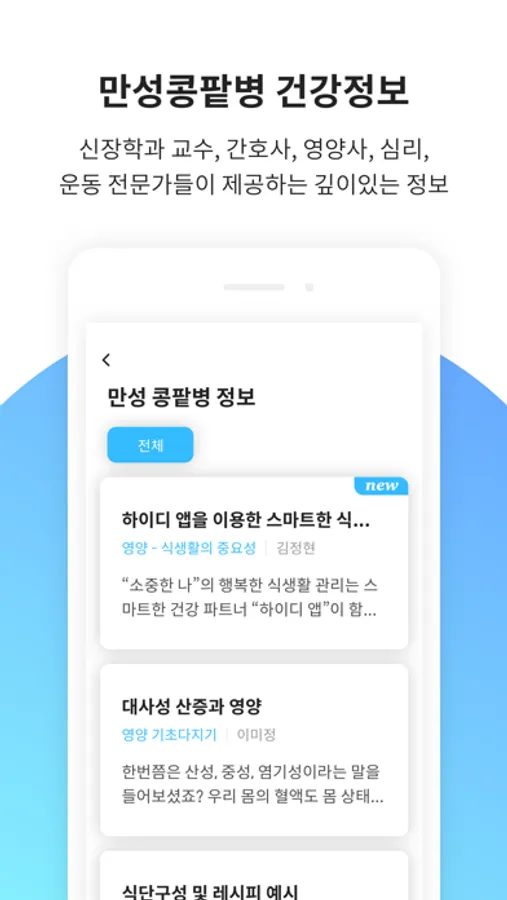만성콩팥병의 일반적 내용부터 영양, 운동, 마음건강, 투석관리에 대한 깊이 있는 정보를 살펴 보세요.