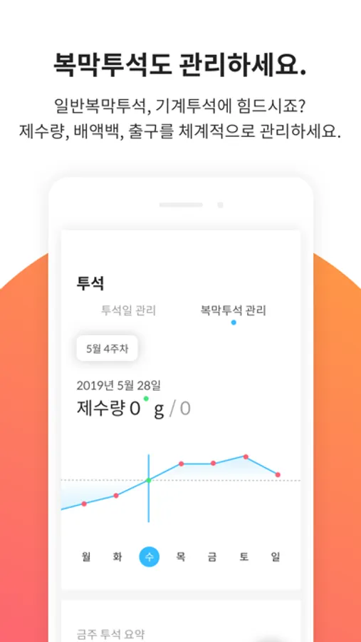 일반 복막투석이나 기계 투석으로 고통받는 분들을 위해 투석에 따른 횟수, 체중, 제수량, 배액백과 출구 사진 등을 기록하고 관리할 수 있어요.