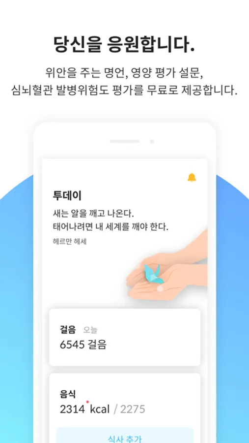 심혈관 질환 발병 위험도 측정 기능, 설문 기반의 영양 평가 기능, 기본정보를 기반으로 목표 자동 설정 기능, 영양성분별 음식 정보 찾기 기능, 위안을 주는 명언 등으로 심리적 위안과 필요한 기능을 무료로 사용할 수 있어요.