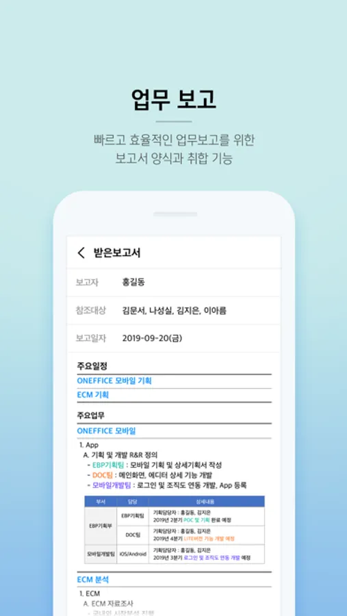 - 언제 어디서나 간편하게 업무보고를 작성하고, 받은 보고서를 취합하여 보고할 수 있습니다.