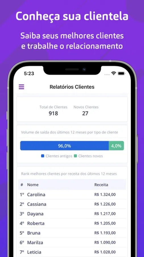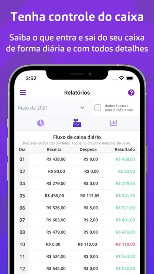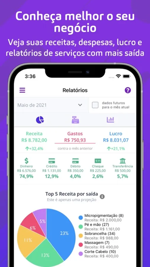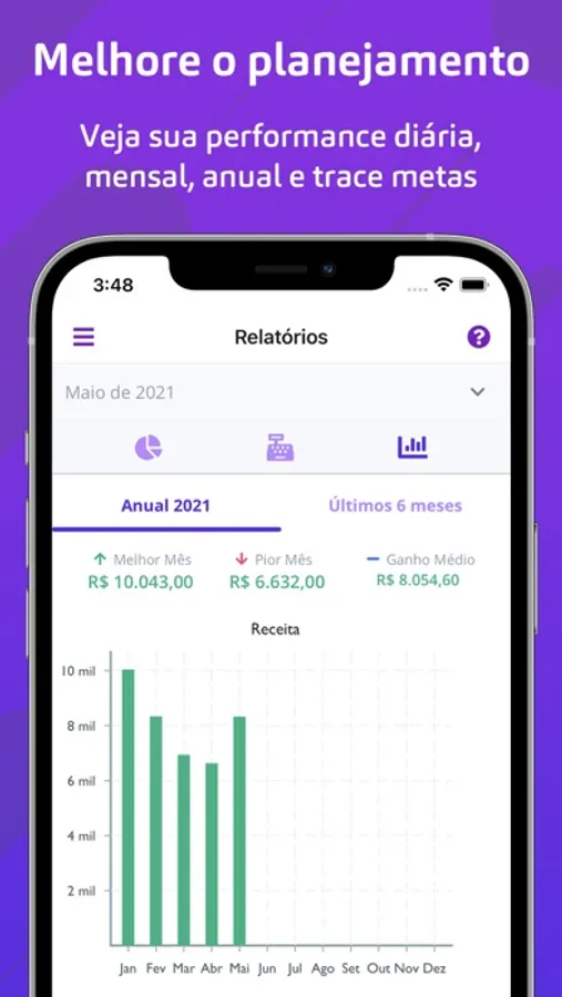 Veja sua receita, despesas, e lucro; Tenha controle do que entra no seu caixa; Veja sua performance diária, mensal, anual; Trace metas;