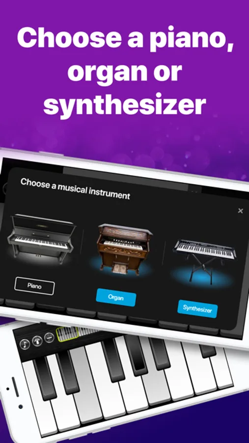 --- 3 instruments to choose from: grand piano, synthesizer, and organ