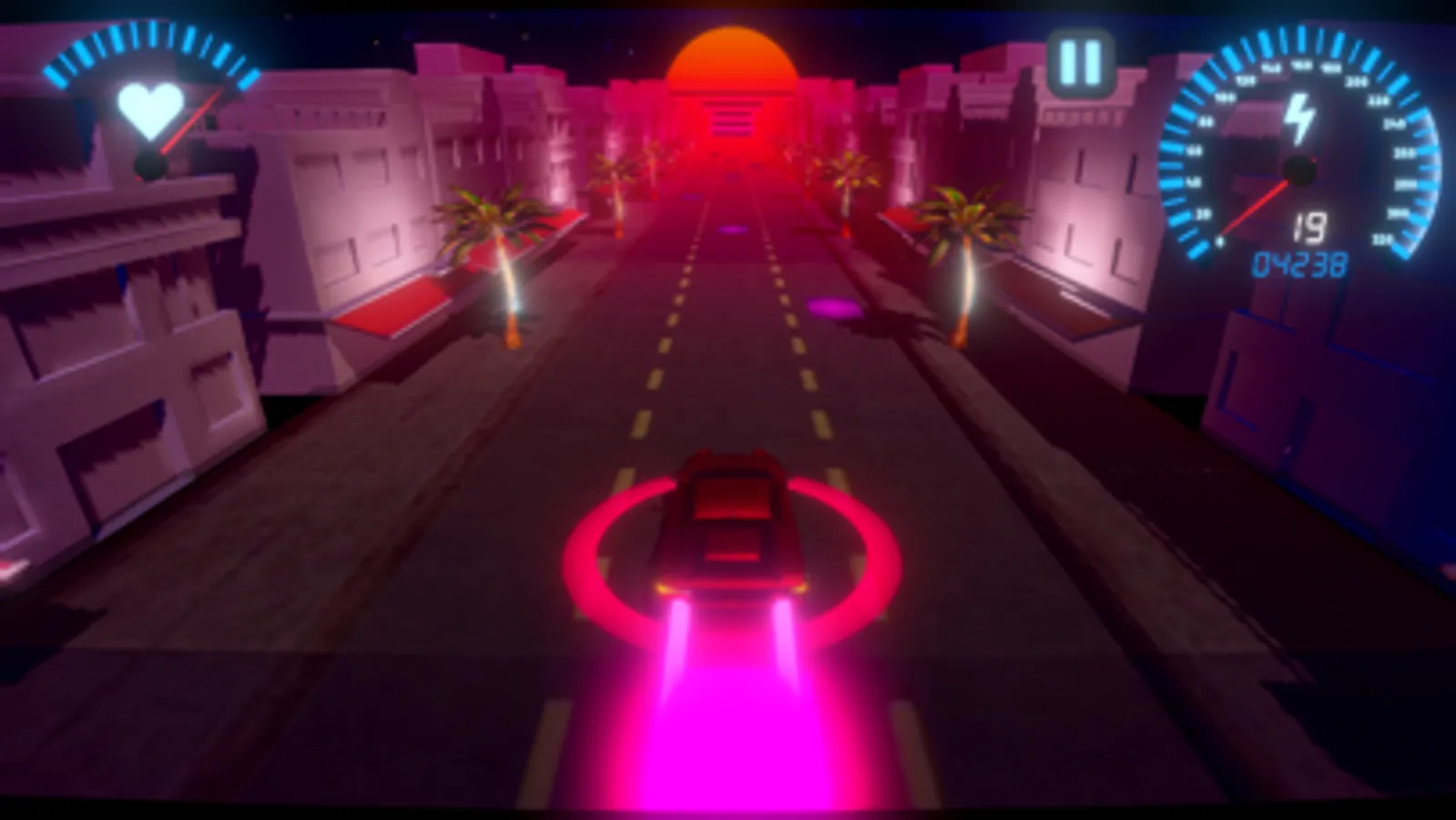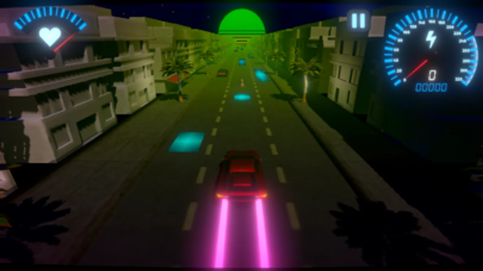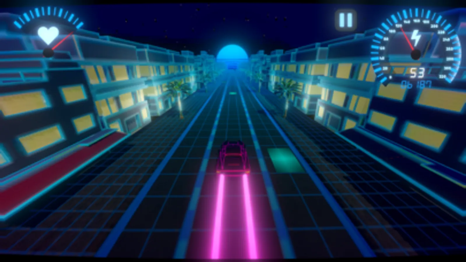 Overdrive is a high powered rhythm game. Take an 80’s themed joyride down the retro neon Miami scene, as you cruise along to the beat. Swerve between lanes to keep up with the music and avoid hazards as you become more engrossed. Tune in to an original soundtrack and watch the scene transform in front of you. Each song affects the speed and visuals of the environment. Buildings begin to bounce and the sun starts to pulsate to the rhythm of the music