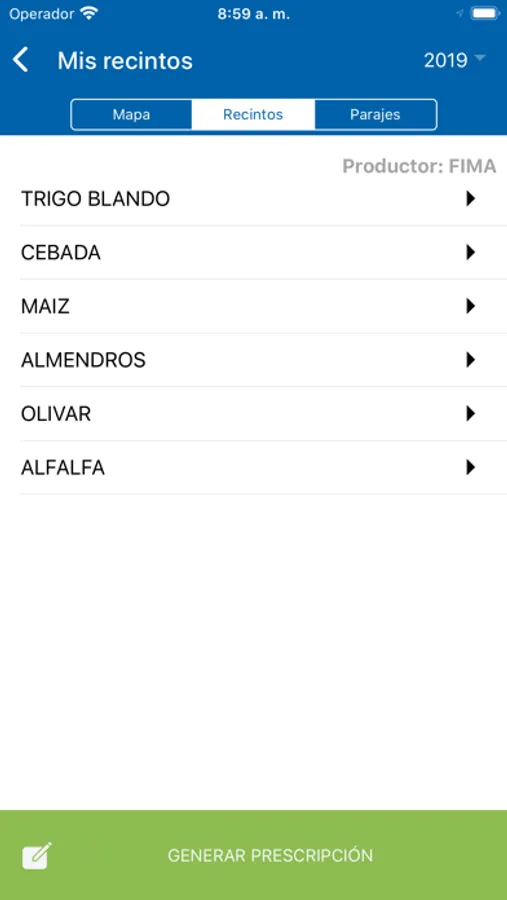 5. Una vez hayas seleccionado productor y cosecha puedes seleccionar los recintos o parajes para los que desees generar la prescripción fitosanitaria: