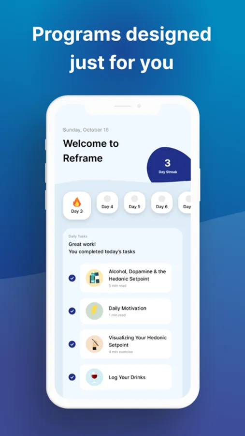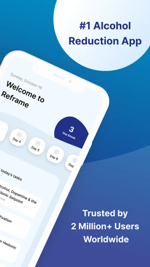 Reframe is the #1 alcohol reduction app, built to help you drink less and live more. Whether your goal is to cut back or quit drinking entirely, Reframe’s neuroscience approach can help you change the way alcohol shows up in your life.