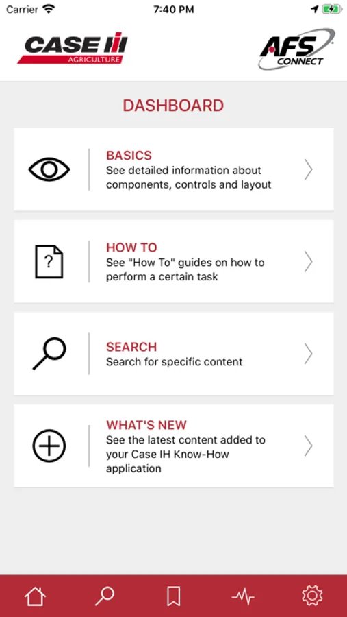 - Give us feedback and suggestions on what support content to create nextThe Case IH Know-How App will provide the operator support material to operate the AFS Pro 1200 display and Multi Control Armrest.