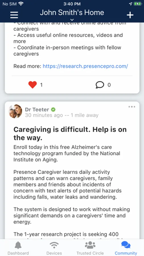 Presence Caregiver learns daily activity patterns and can warn caregivers, family members and friends about incidents of concern with text alerts of potential hazards including falls, water leaks and wandering. The system is designed to work without making significant demands on a caregivers’ time and energy.