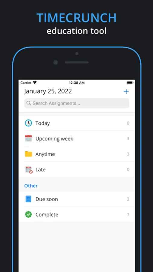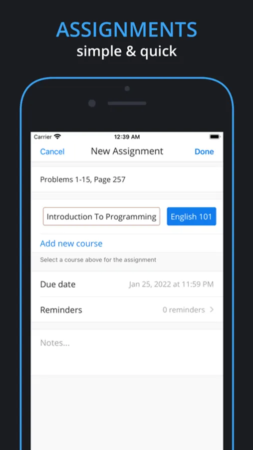 Unlimited assignments all year round and they can be used with or without a course. Each assignment can have a reminder, due date, and notes. Find any completed assignment in the settings tab by using the search bar.
