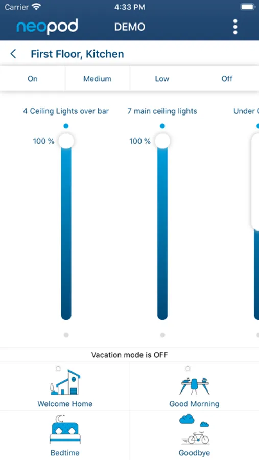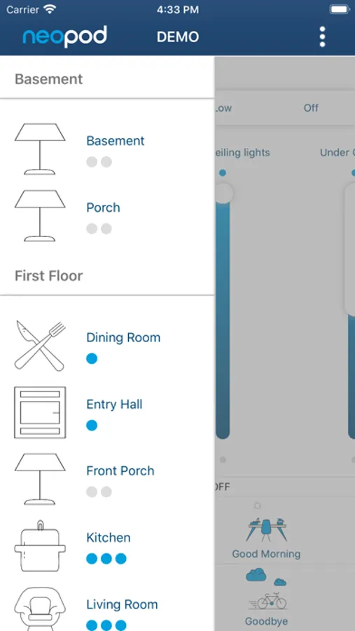 The neopod app enables you to control neopod lighting system, in your home, from your phone or tablet. Scroll between floors and rooms. Control any individual light or use room controls to control an entire room or whole house presets to control your entire house.