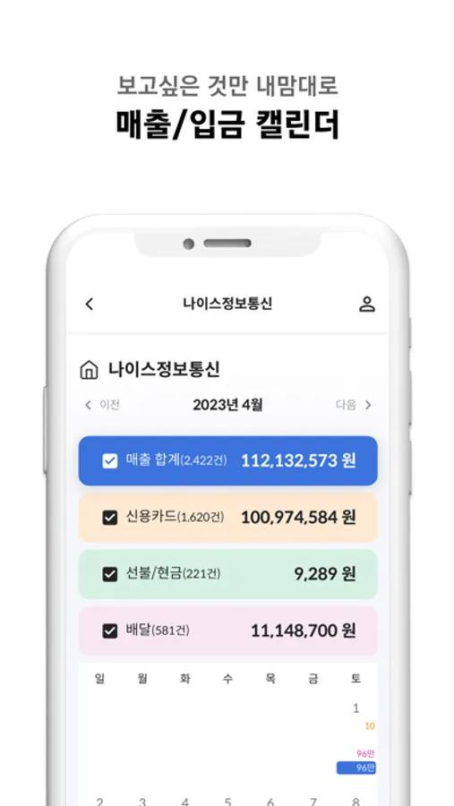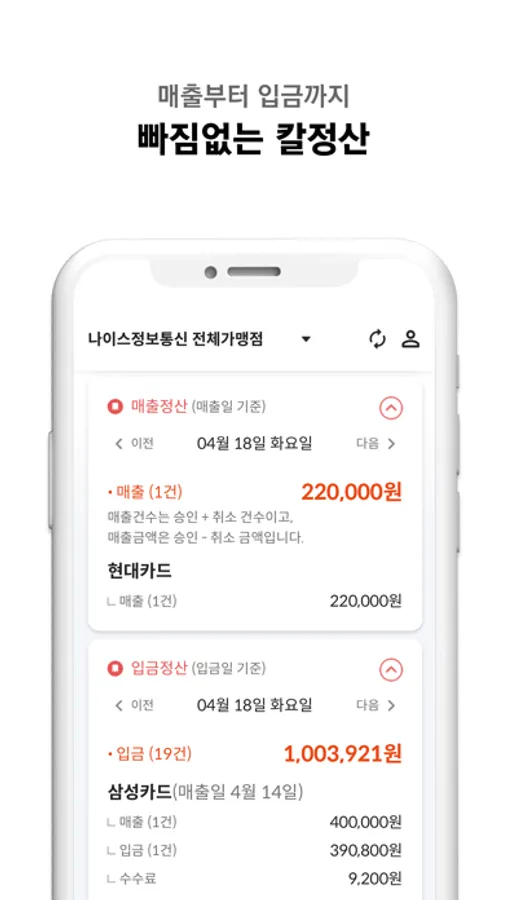 카드사에서 입금되는 금액을 관리하기가 제일 어려워요. 나이스체크 앱에서는 카드사에서 오늘 가맹점 계좌에 입금되는 정보를 한눈에 확인할 수 있어요.