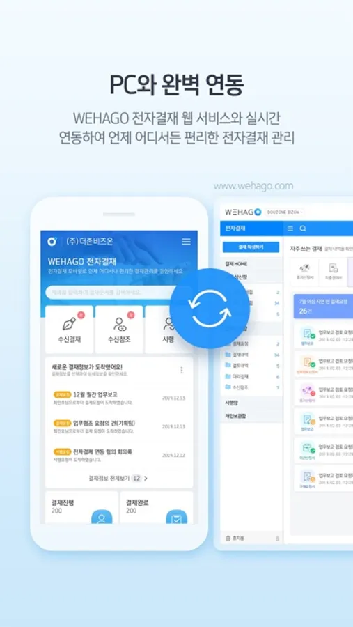 PC와 완벽 연동 - WEHAGO 전자결재 웹 서비스와 실시간 연동하여 언제 어디서든 전자결재 업무를 수행하세요!