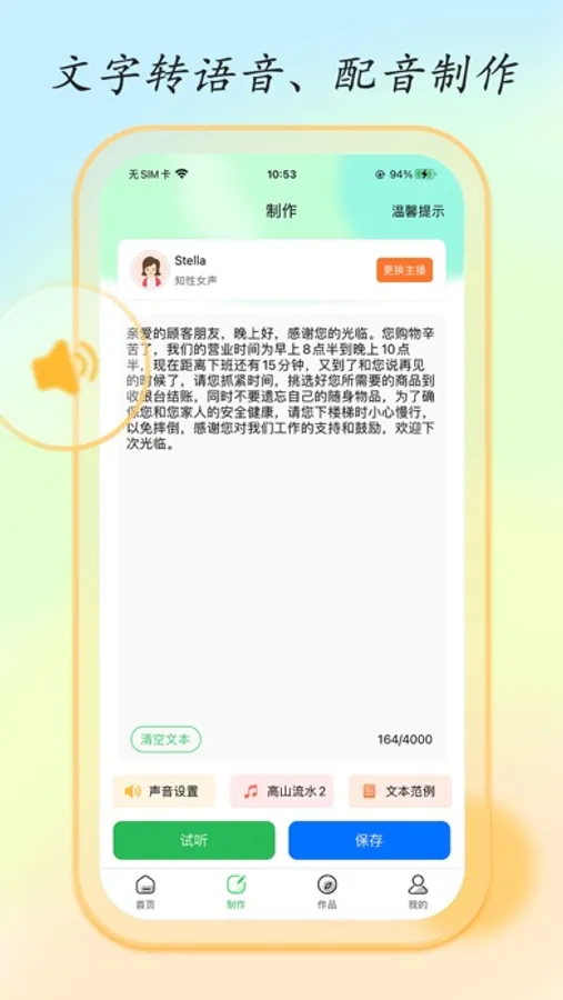 支持中文、英文内容转语音、配音,支持内容实时编辑、合成。支持背景音乐合成,背景音量调节等。