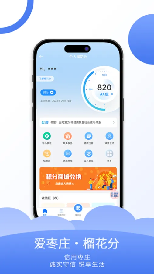 完善枣庄市信用体系建设,打造信用枣庄榴花分平台,居民在榴花分平台提高个人诚信分,可在生活中享受更多的优惠。