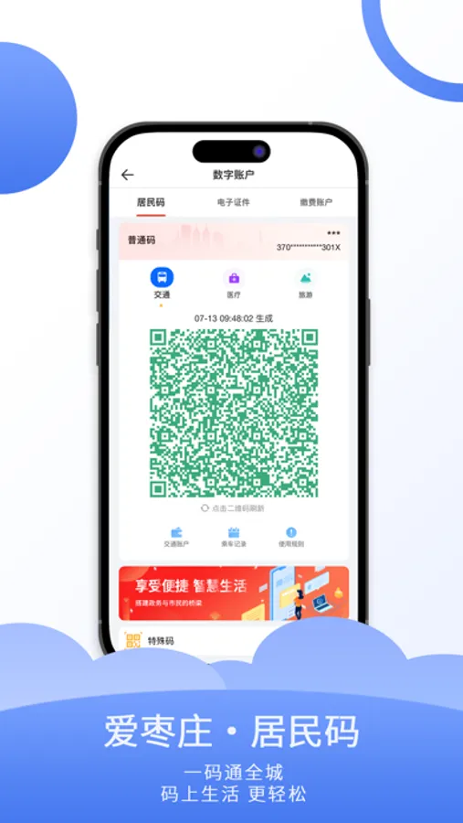 枣庄居民码,一码通全城。用户使用枣庄居民码可在枣庄五区一市范围内乘坐公共交通出行,无需切换乘车码。