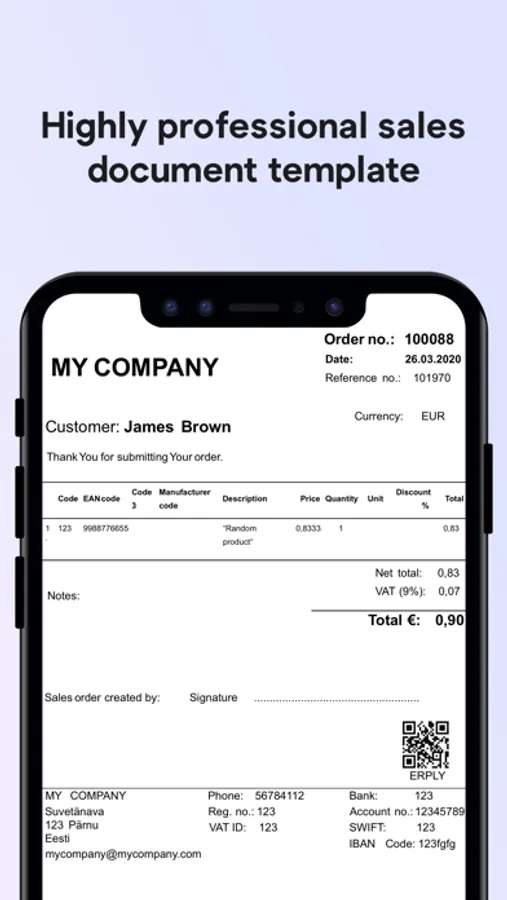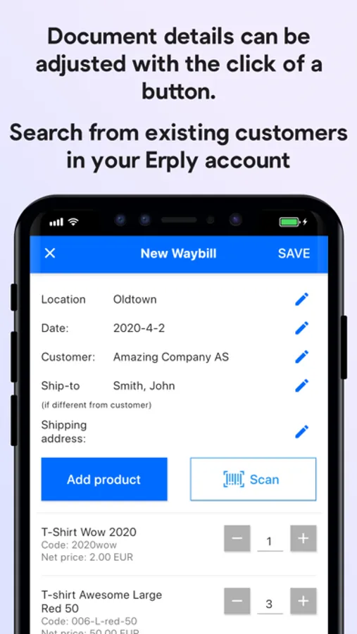 Create and send professional invoices, orders and waybills right from your mobile device! Erply Invoice automatically syncs all sales documents with your Erply Back Office so you never lose track of your records. The Erply Invoice app is an easy-to-use mobile solution that keeps you and your customers on the same page.