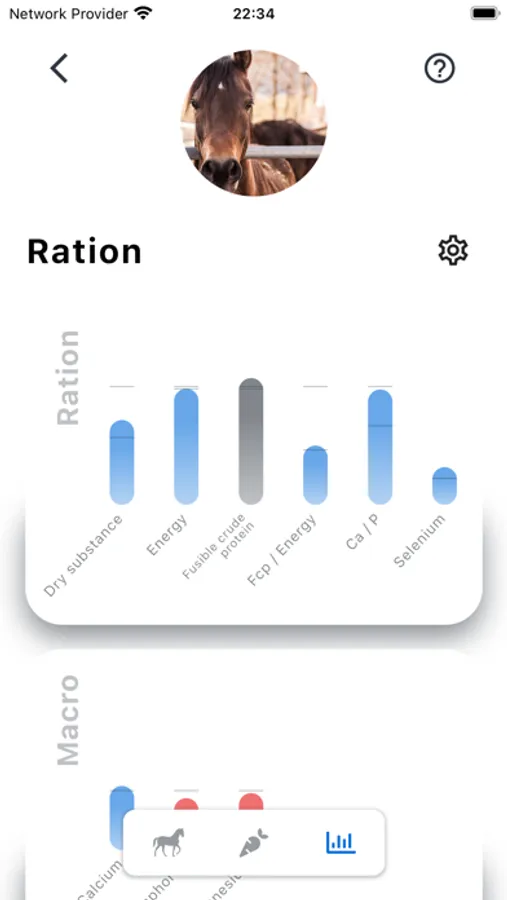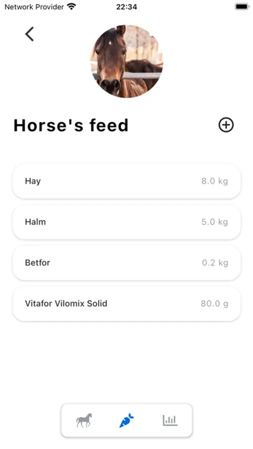 In the app, you save the values of your horse, such as weight, age, work, etc. then you save the values of the horse's feed and then you can immediately get a complete ration that shows what the horse needs, what the horse gets and what the difference is between the intake and what the horse needs.