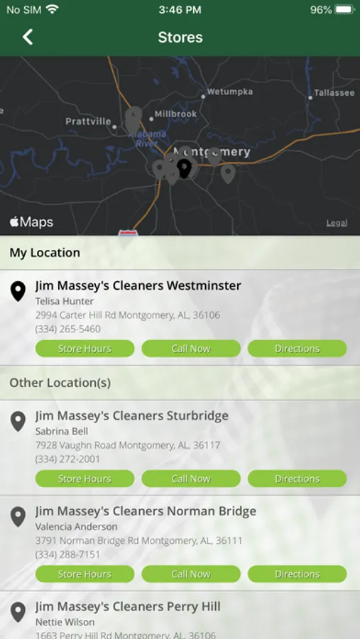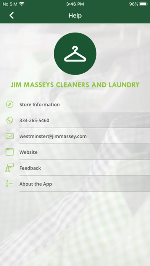 5) Quickly contact Jim Massey Cleaners by phone or email and access their website all directly from your device.