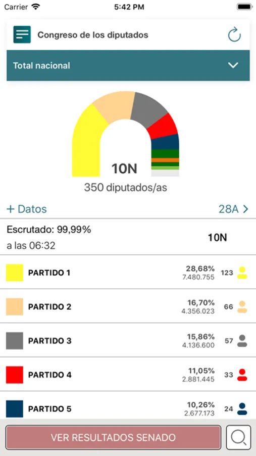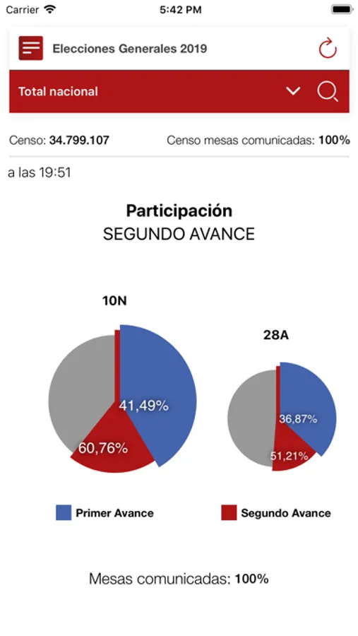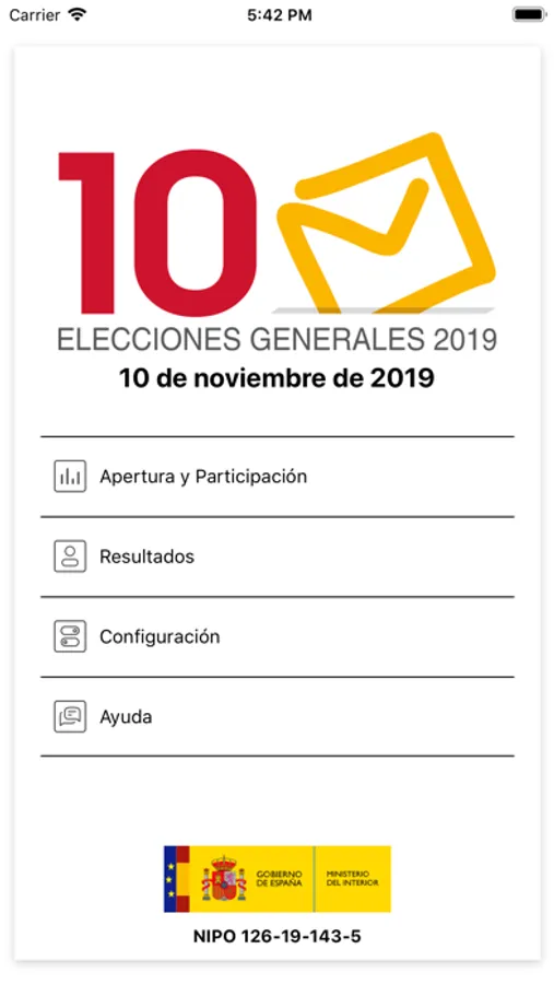 “Elecciones Generales 10N 2019” es la aplicación oficial y gratuita que el Ministerio del Interior pone a disposición de los ciudadanos para consultar los resultados provisionales de las elecciones a Cortes Generales del 10 de Noviembre de 2019 en España. Permite consultar en tiempo real los resultados provisionales obtenidos por todas las candidaturas por ámbito geográfico (Total Nacional, Comunidad Autónoma, Provincia, Isla, Municipio y distrito), tanto en las elecciones al Congreso de los diputados como en las elecciones al Senado. También muestra resultados comparativos con las elecciones celebradas el 28 de Abril de 2019.