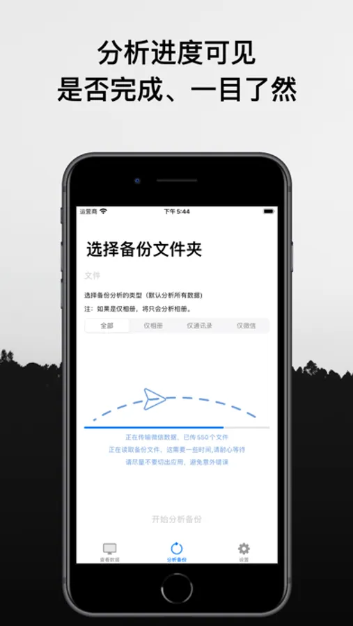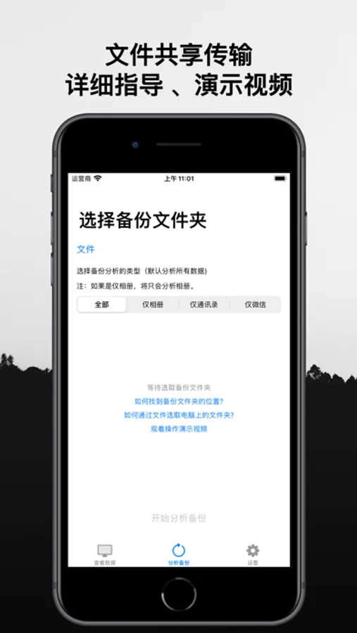 问题1,备份通常很大,您可能存储了不少照片、微信文件在备份里面,所谓分析备份,很大一部分时间都花在了数据传输上。更新后的应用采用了smb文件共享传输方式,通过局域网wifi连通了手机与电脑,而且仅仅传输照片,微信,通讯录文件,即使如此,要传输的数据可能会是几个G或十几个G,而1个G要传输的时间可能就要15分钟,传输的快慢取决于文件大小和文件数量,这个过程比较漫长,也无法优化解决,只能耐心等待传输完成。