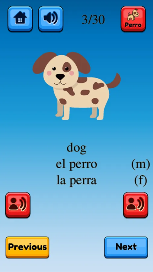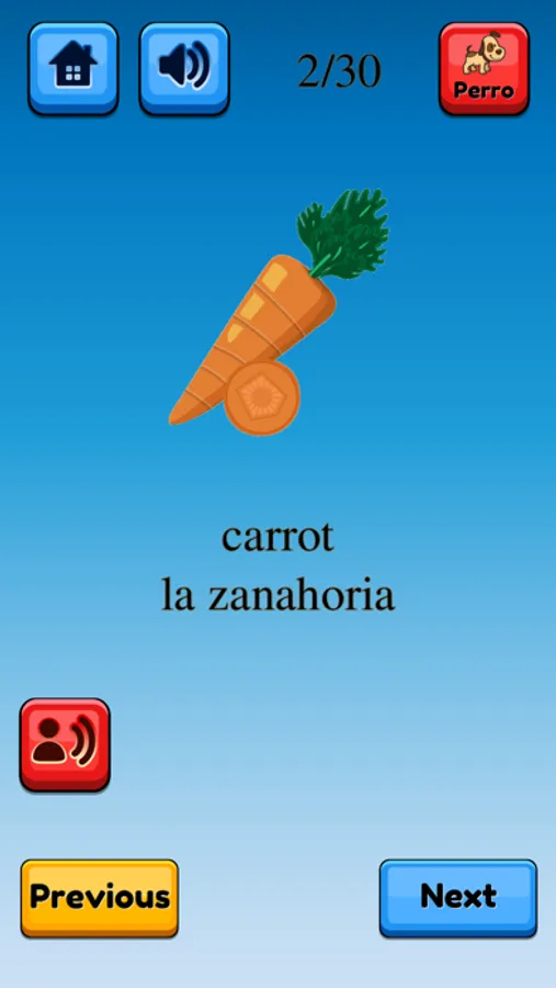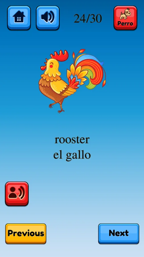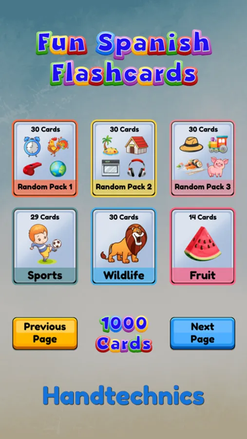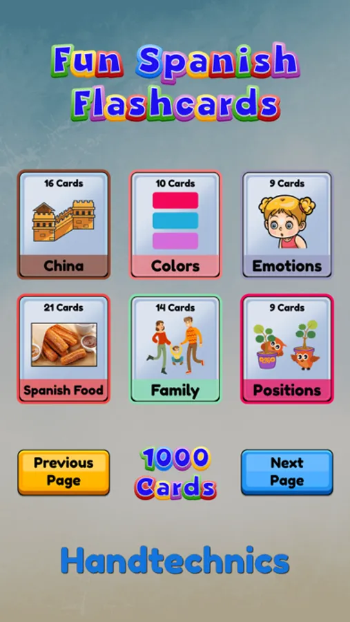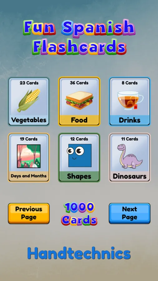 Fun Spanish Flashcards contains words from 50 categories, such as sports, wildlife, fruit, vegetables, food, drinks, Spanish food, shapes, dinosaurs, aquatic animals, domestic animals, small creatures, birds, nature, buildings, home, kitchen, bathroom, school, rooms, transportation, clothing, toys, space, technology, body, tools, nuts and seeds, sweets, music, professions, weather, China, colors, emotions, days and months, family, positions, actions, adjectives, countries, flags, and numbers.