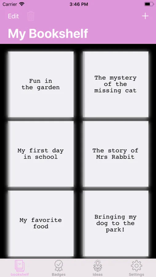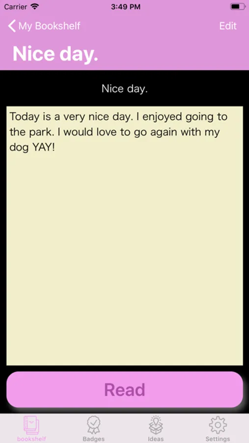 "My Bookshelf" will be the page where all your unique books will be stored. You can re-read these books or let ReadingPal read them for you. You can also edit your books. Write a book after pressing the plus button on the bookshelf and you can choose between typing or speaking out your book. After certain number of books are created, you can earn more badges!