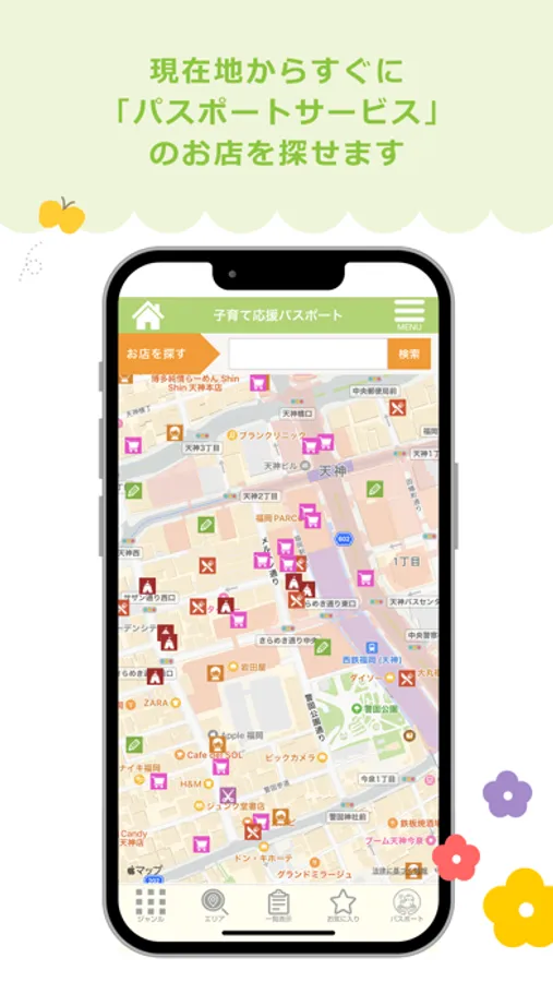 18歳未満の子どもがいる子育て家庭を対象に、商品の割引やミルクのお湯の提供など様々なサービスを提供するお店を検索できる地図アプリです。