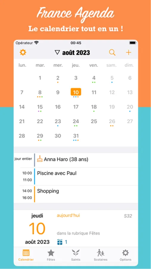 France Agenda est le calendrier tout en un, créée spécifiquement pour la France. La première application iOS à présenter à la fois les JOURS DE FÊTE, les JOURS FÉRIÉS, les VACANCES SCOLAIRES, les SAINTS DU JOUR, les PRÉNOMS À FÊTER, les ANNIVERSAIRES de votre carnet d’adresses, les DÉPARTEMENTS FRANÇAIS, les INDICATIFS TÉLÉPHONIQUES ÉTRANGERS et les INFOS PRATIQUES. L’application ultra pratique pour ne rien oublier ni personne !