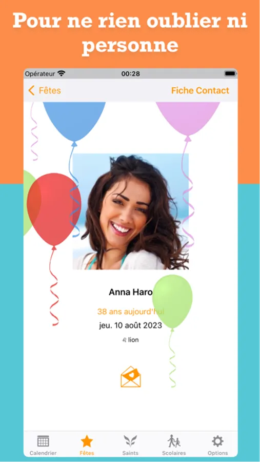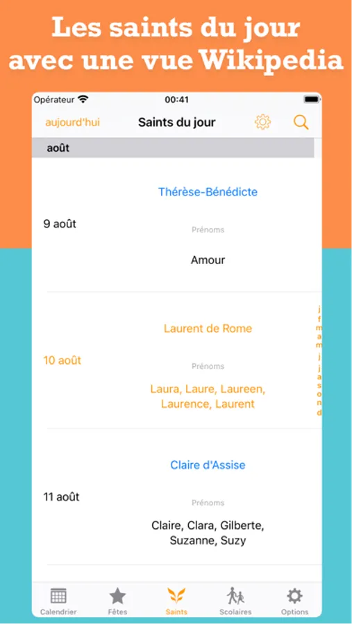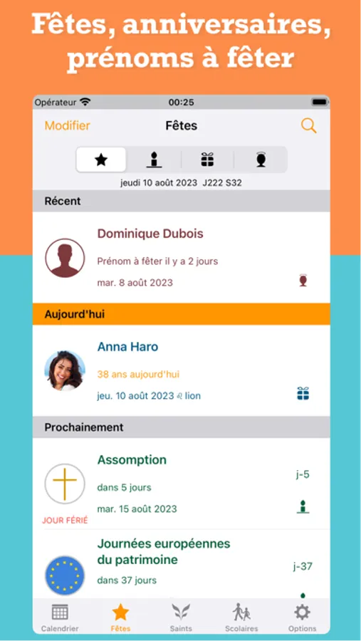 • Les "Prénoms à fêter" comporte les prénoms dérivés des saints et les synchronise avec les prénoms de votre carnet d’adresses.