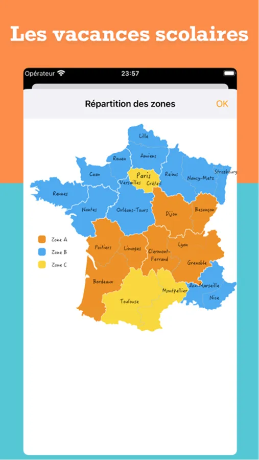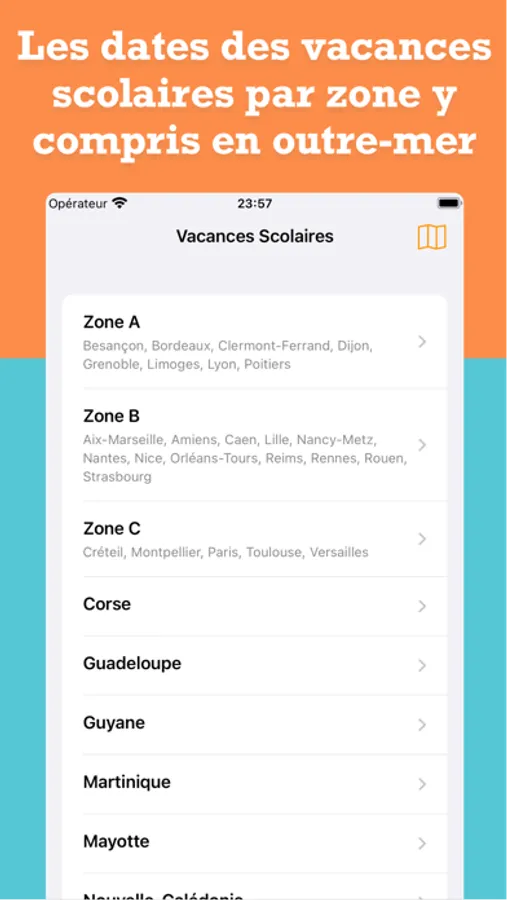 • Les dates des vacances scolaires peuvent être ajoutées au calendrier natif iOS ! Les événements sont tout simplement ajoutés, sans besoin d'abonnement ou connexion internet. Vous pouvez choisir quels événements vous voulez ajouter, example.. académie - année. Vous pouvez également les supprimer après les avoir ajoutés.