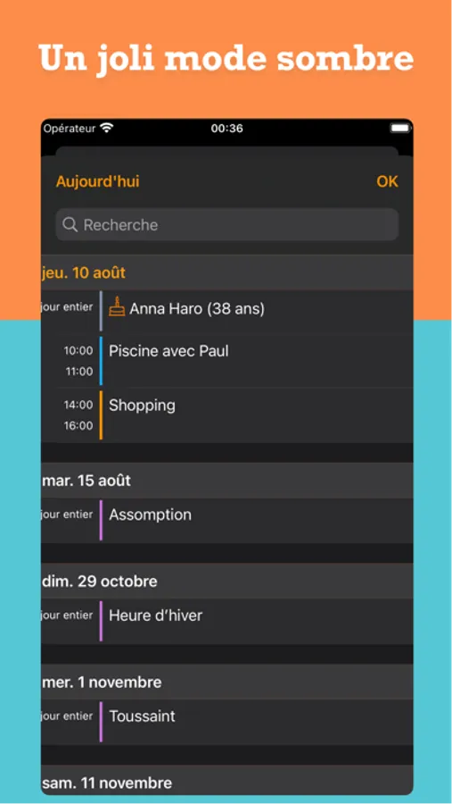 • Compatible avec tous les événements de la base de données native iOS calendrier.