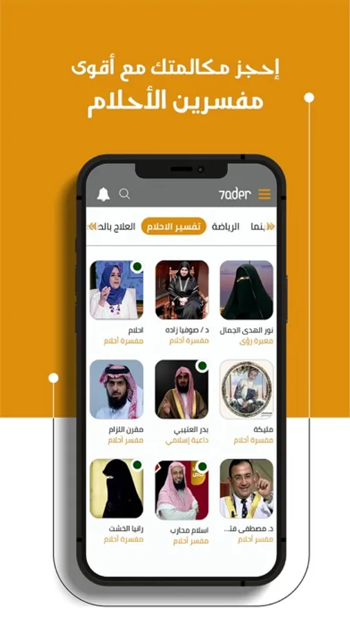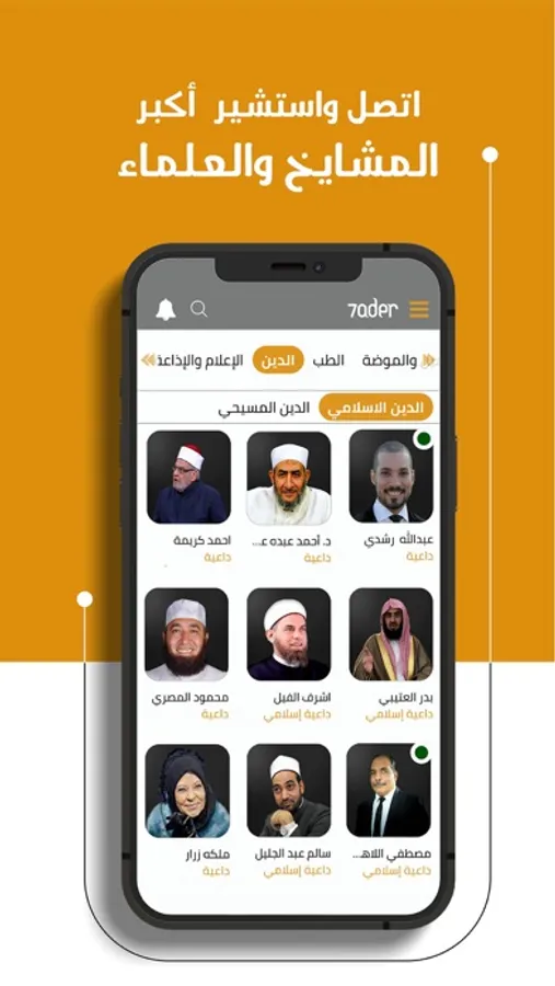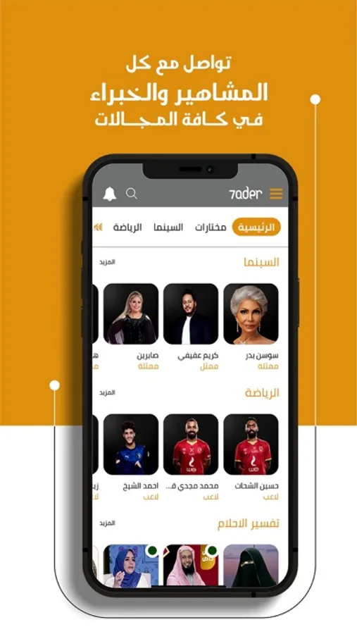 With 7ader you can call easily, whether you want to call art and music stars or sport stars or have a question for kitchen stars to know different types of delicious foods, or need medical advice, or legal advice, or have a question or problem and want to know the Religion opinion, in the present with us the largest sheikhs in the sciences of religion, communicate with them personally, with 7ader there is no mediator between the fans and the star.
